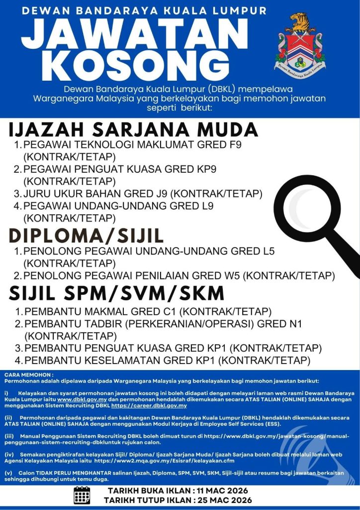 Calon yang berminat dinasihatkan untuk membuat permohonan segera sebelum tarikh tutup pada 25 Mac 2026 melalui portal rasmi DBKL.
