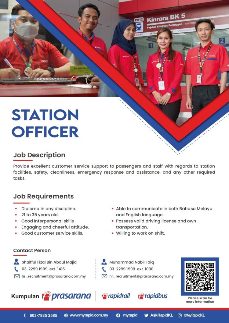 Untuk maklumat lanjut atau sebarang pertanyaan berkenaan jawatan di Prasarana, anda boleh hubungi Shaifful Fizal di talian 03 2299 1999 atau Muhammad Nabil Faiq di talian 03 2299 1999.