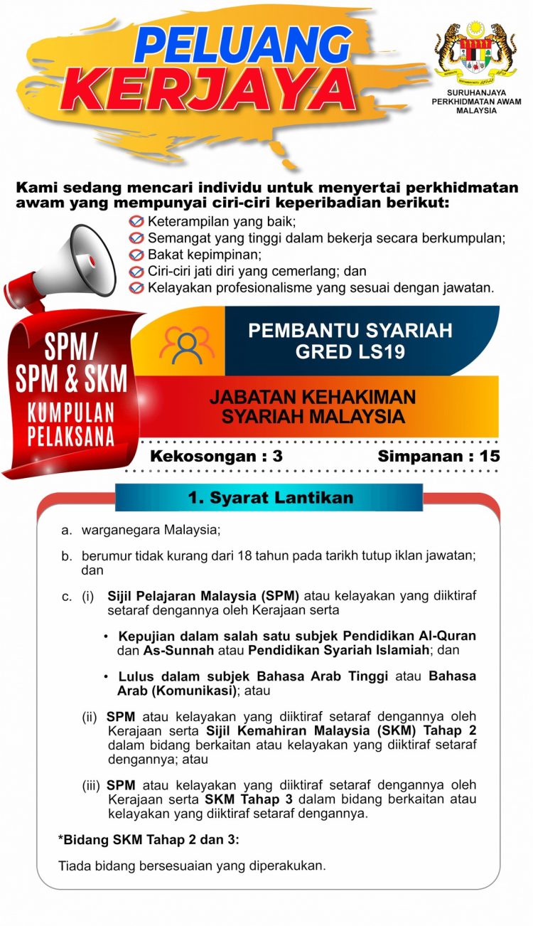 Warganegara Malaysia yang cukup syarat kelayakan yang ditetapkan dan berumur tidak kurang daripada 18 tahun pada tarikh tutup jawatan adalah dipelawa untuk mengisi kekosongan jawatan Pembantu Syariah Gred LS19 yang ditawarkan oleh Jabatan Kehakiman Syariah Malaysia.