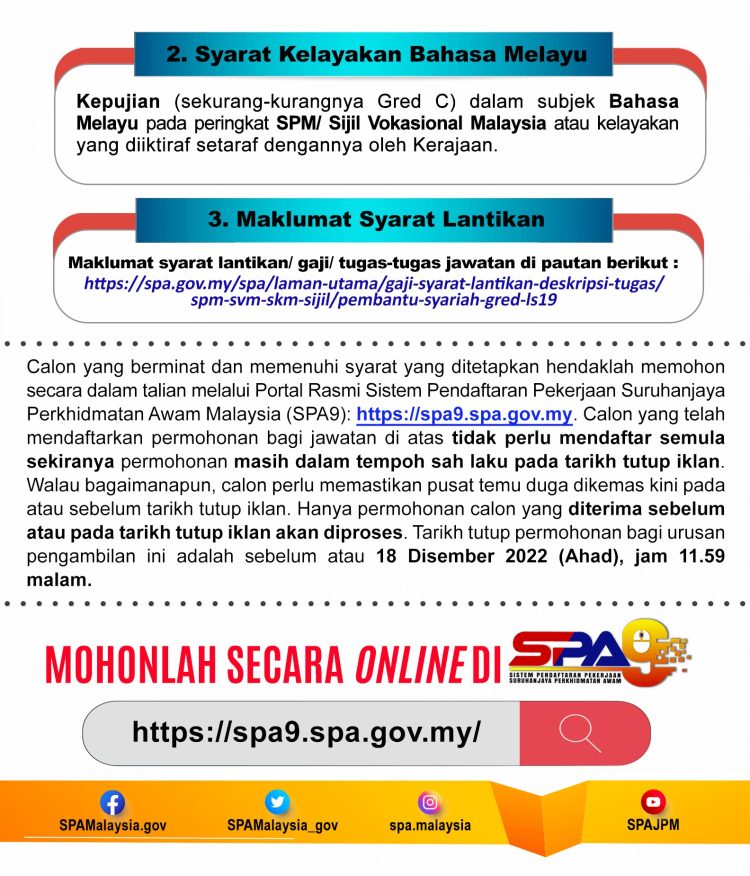 SPA amat menggalakkan calon yang berkelayakan dan memiliki minima SPM untuk mohon jawatan yang ditawarkan. Permohonan boleh dibuat sehingga 18 Disember 2022 melalui sistem SPA9.