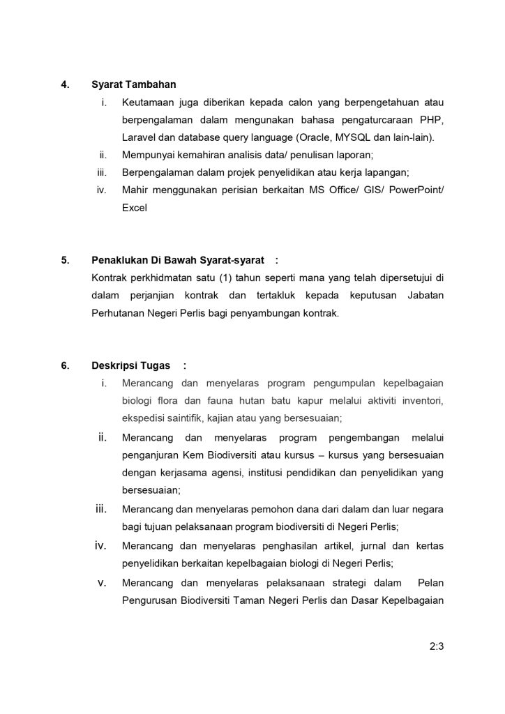Jabatan Perhutanan Negeri Perlis membuka pengambilan Personel MySTEP dengan dua kekosongan berbeza melibatkan kerja GIS/AutoCAD teknikal dan penyelidikan biodiversiti. Iklan ini bernilai tinggi kepada calon yang ada kemahiran pemetaan, analisis data, kerja lapangan serta latar belakang kejuruteraan/perhutanan/sains biodiversiti.
