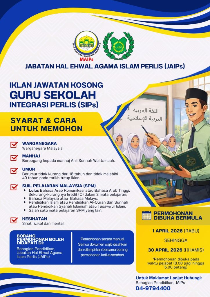 Bagi lepasan SPM khususnya aliran agama yang sedang mencari peluang pekerjaan dalam bidang pendidikan, ini merupakan satu peluang yang tidak boleh dilepaskan. Jawatan Guru Sekolah Integrasi Perlis (SIPs) menawarkan laluan kerjaya dalam sektor pendidikan agama di bawah pentadbiran negeri Perlis.