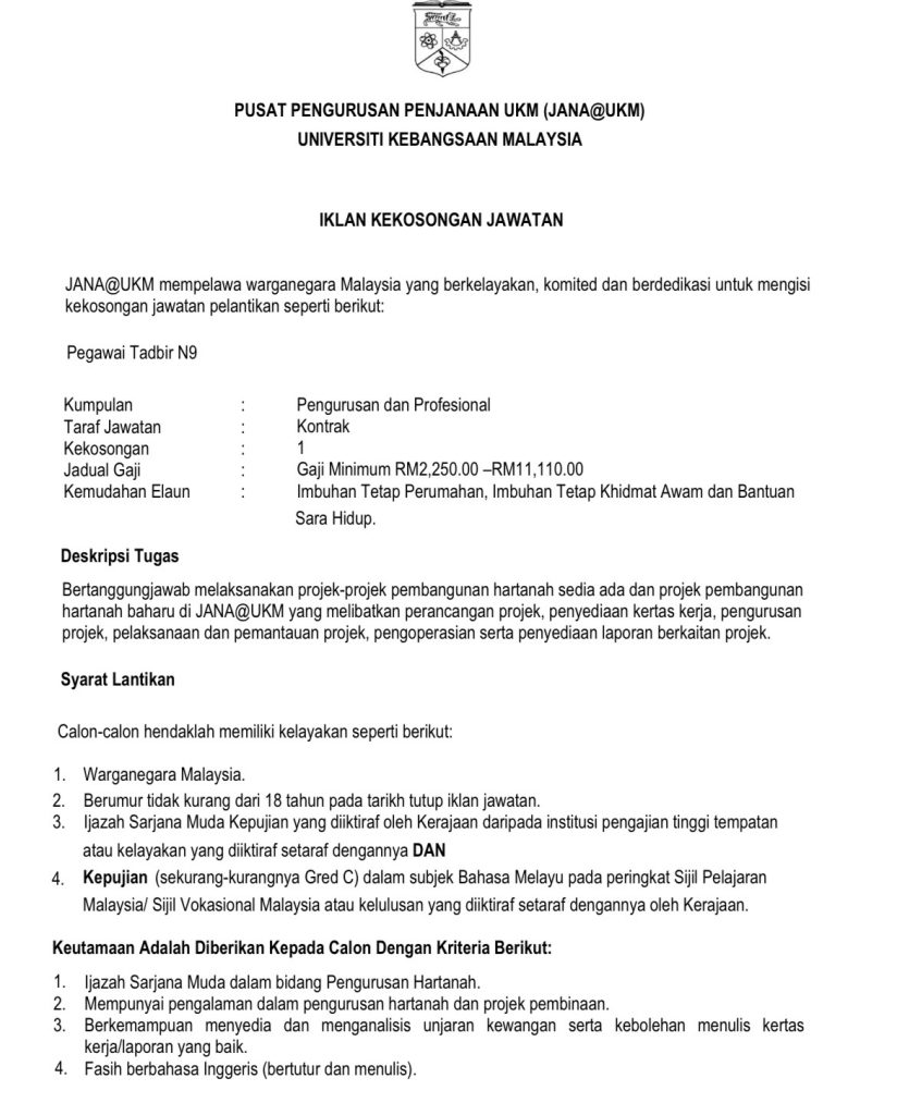 Jawatan kosong UKM 2026 kini dibuka untuk Pegawai Tadbir Gred N9 di bawah JANA@UKM. Peluang ini terbuka kepada warganegara Malaysia yang berkelayakan dan berminat dalam bidang pengurusan projek serta pembangunan hartanah.