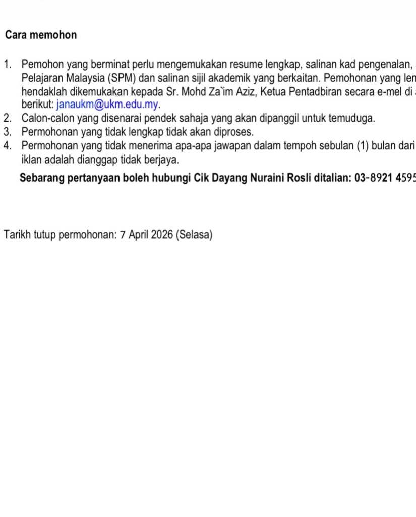 Dengan hanya 1 kekosongan dan tarikh tutup pada 7 April 2026, calon perlu bertindak segera dan memastikan permohonan lengkap serta berkualiti.