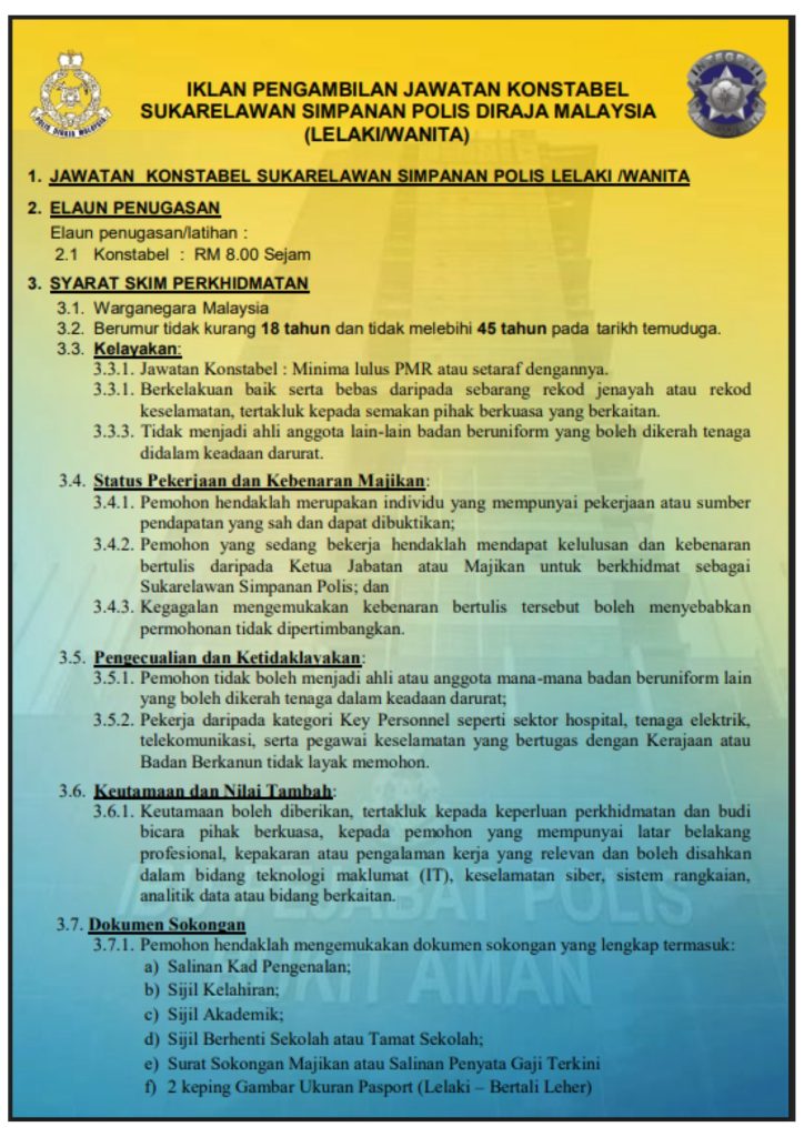 Jawatan Konstabel Sukarelawan Simpanan (PVR) Polis Diraja Malaysia — Walk-In Interview Seluruh Malaysia (Lelaki/Wanita)