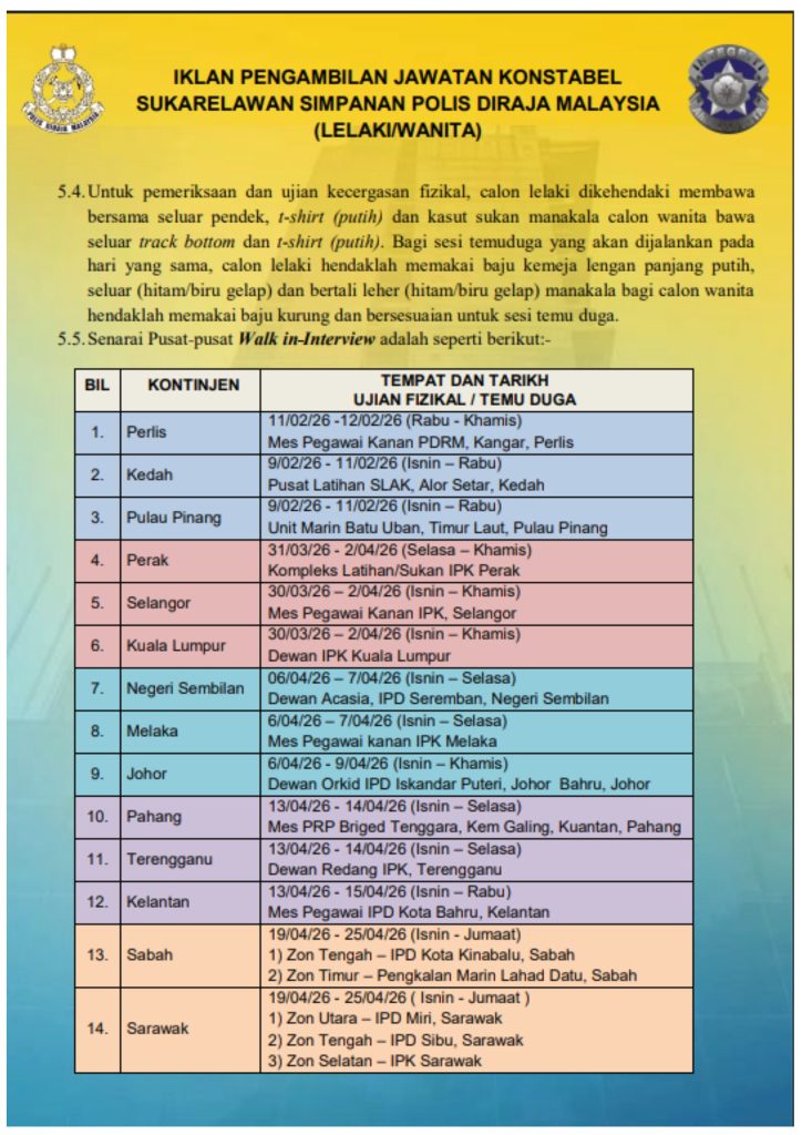 PDRM membuka pengambilan Konstabel Sukarelawan Simpanan (PVR) melalui walk-in interview + ujian fizikal mengikut jadual negeri bermula Februari hingga April 2026. Peluang ini terbuka kepada lelaki dan wanita yang memenuhi syarat umur, fizikal, serta mempunyai pekerjaan/sumber pendapatan sah (dengan kebenaran majikan).