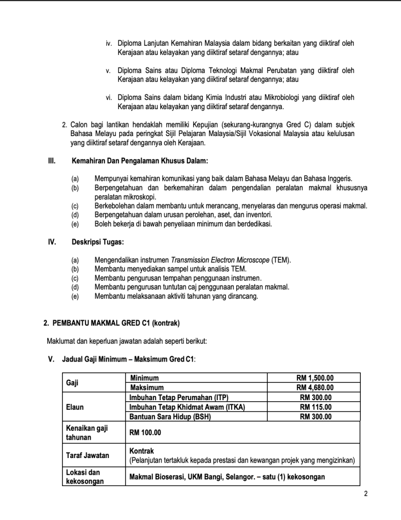 Pengambilan ini melibatkan dua jawatan dalam bidang makmal penyelidikan iaitu Penolong Pegawai Sains Gred C5 dan Pembantu Makmal Gred C1. Kedua-dua jawatan ini memainkan peranan penting dalam menyokong aktiviti penyelidikan, pengendalian instrumen makmal serta pengurusan bahan dan sampel ujian di UKM.