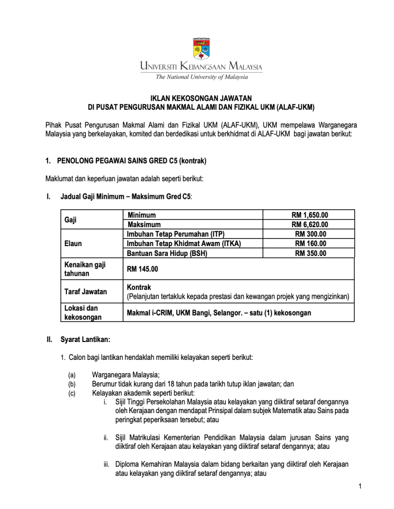 Universiti Kebangsaan Malaysia (UKM) melalui Pusat Pengurusan Makmal Alami dan Fizikal UKM (ALAF-UKM) kini membuka peluang kerjaya kepada warganegara Malaysia yang berkelayakan untuk mengisi beberapa kekosongan jawatan kontrak di UKM Bangi, Selangor.