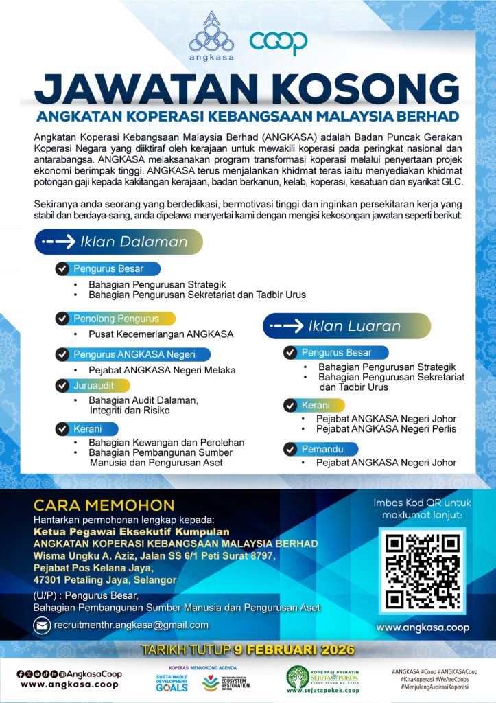 Angkatan Koperasi Kebangsaan Malaysia Berhad (ANGKASA) mempelawa calon berkelayakan untuk mengisi pelbagai kekosongan jawatan melibatkan peringkat pengurusan, audit, pentadbiran dan sokongan di ibu pejabat serta pejabat negeri.