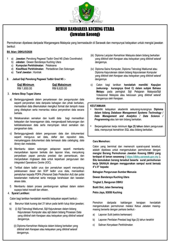 Bagi individu yang berminat untuk membina kerjaya dalam sektor kerajaan negeri Sarawak, peluang pekerjaan yang ditawarkan oleh Dewan Bandaraya Kuching Utara (DBKU) ini adalah antara yang perlu diberi perhatian. Jawatan ini memberi peluang kepada calon yang mempunyai latar belakang dalam pengurusan data dan teknologi maklumat untuk menyertai perkhidmatan awam.