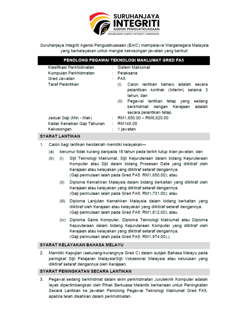 Berita baik kepada calon berkelayakan dalam bidang teknologi maklumat. Suruhanjaya Integriti Agensi Penguatkuasaan (EAIC) kini membuka peluang kerjaya bagi mengisi kekosongan jawatan Penolong Pegawai Teknologi Maklumat Gred FA5 bagi tahun 2026.
