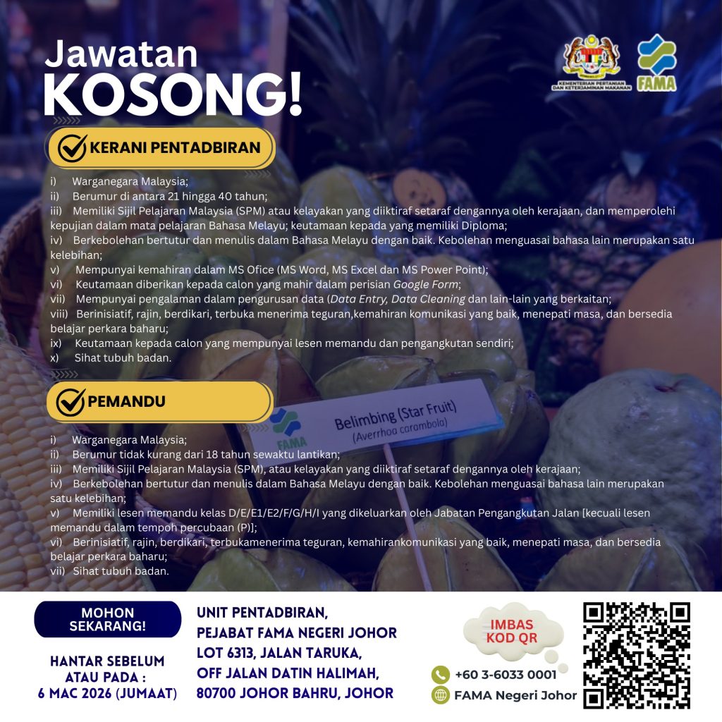 Jawatan kosong FAMA Negeri Johor ini merupakan peluang baik kepada calon tempatan yang ingin berkhidmat dalam agensi kerajaan bertaraf persekutuan. Pastikan permohonan dihantar lengkap dan sebelum 6 Mac 2026.