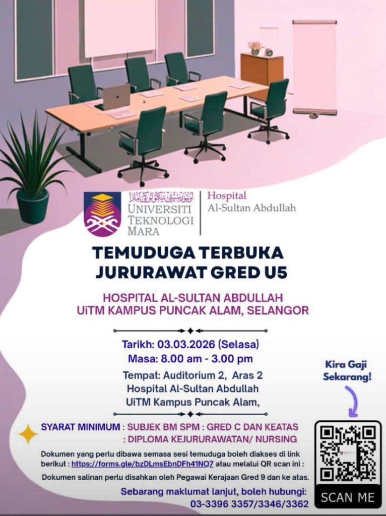 Temuduga Terbuka Jururawat Gred U5 oleh Hospital Al-Sultan Abdullah UiTM ini adalah peluang terbaik untuk graduan Diploma Kejururawatan yang ingin memulakan kerjaya di hospital pengajar dengan pendedahan klinikal berkualiti.
