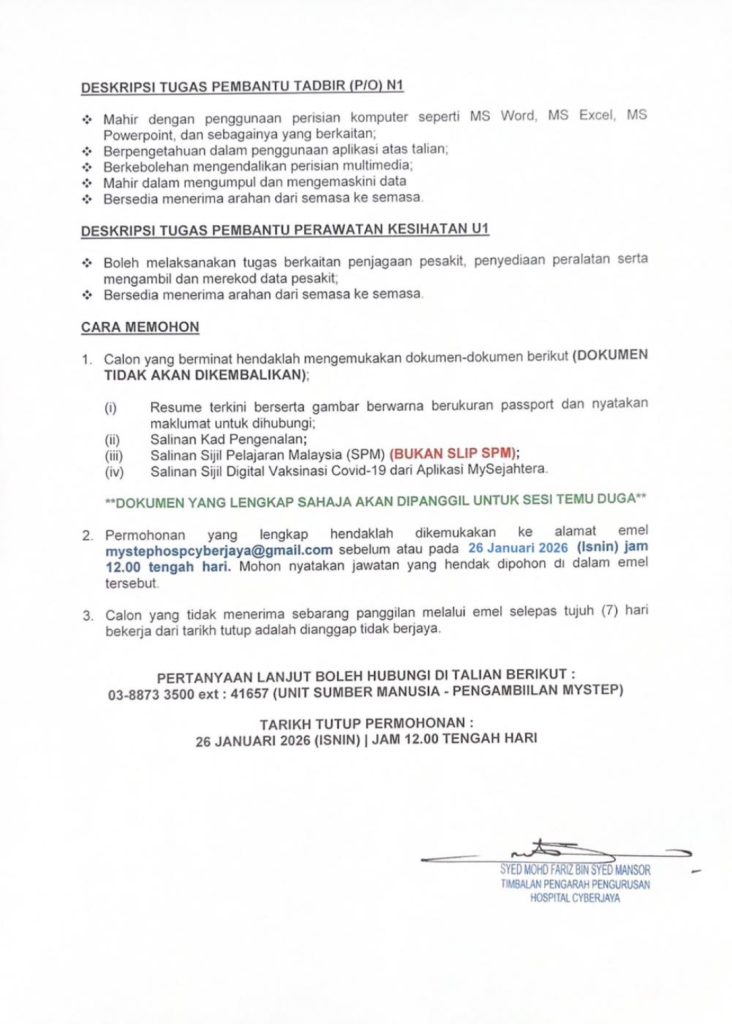 Peluang jawatan Personel MySTEP Hospital Cyberjaya 2026 ini terbuka kepada lepasan SPM yang memenuhi syarat kelayakan dan bersedia bekerja dalam tempoh kontrak yang ditetapkan. Oleh itu, calon disarankan memastikan resume lengkap bergambar saiz pasport, semua dokumen sokongan disertakan, serta permohonan dihantar sebelum tarikh tutup yang ditetapkan.