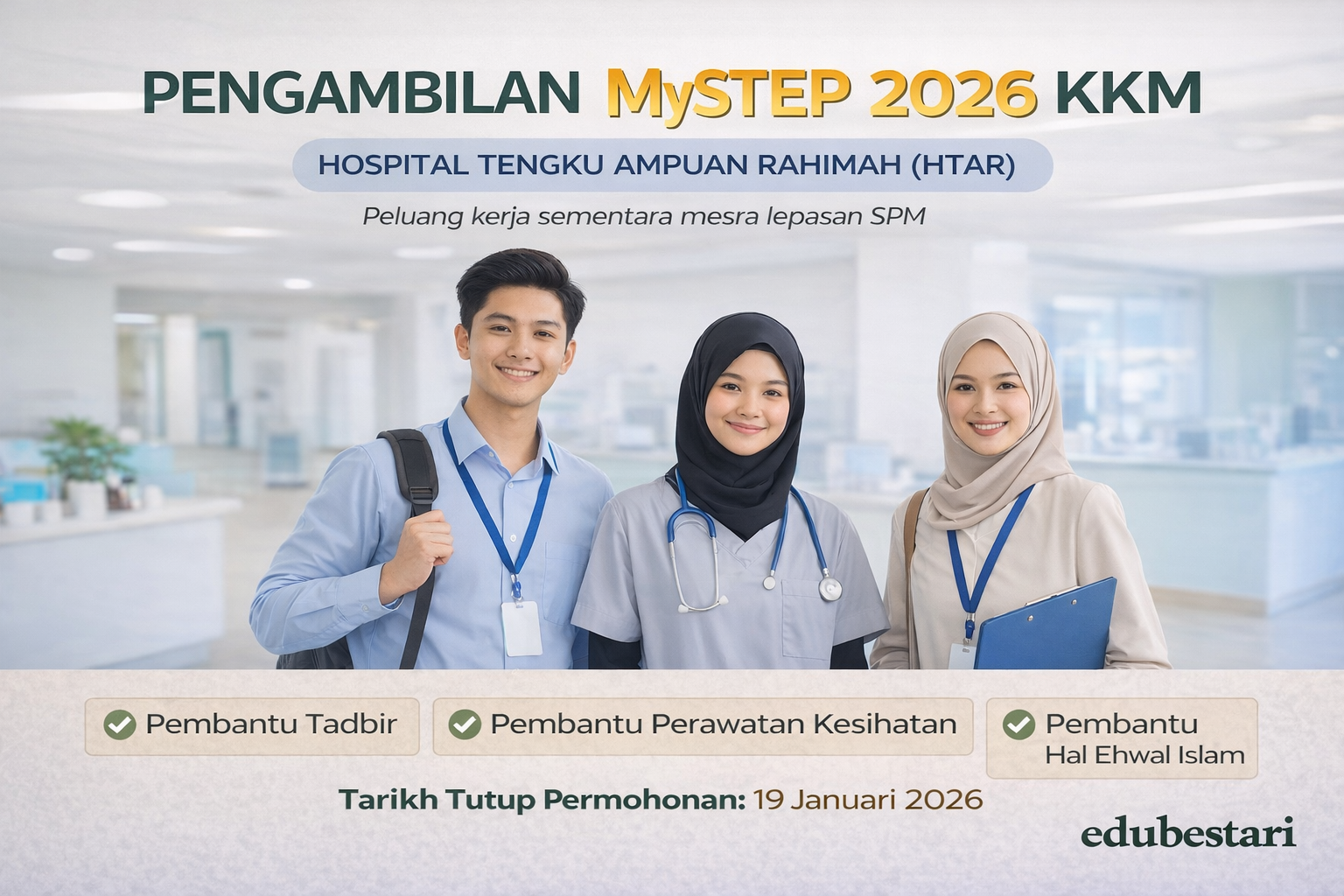 Peluang kerjaya jangka pendek kini dibuka untuk lepasan SPM dan pencari kerja yang berminat membina pengalaman dalam sektor kesihatan awam. Kementerian Kesihatan Malaysia melalui Hospital Tengku Ampuan Rahimah (HTAR) mempelawa warganegara Malaysia untuk memohon pengambilan personel MySTEP 2026.