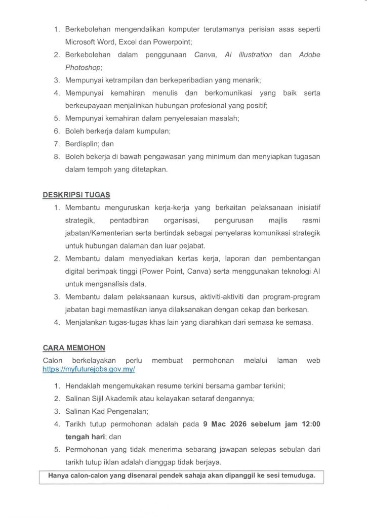 Jawatan ini ditawarkan melalui program Malaysia Short-Term Employment Programme (MySTEP) yang bertujuan memberi peluang pekerjaan kepada graduan serta membantu jabatan kerajaan melaksanakan projek dan inisiatif strategik.