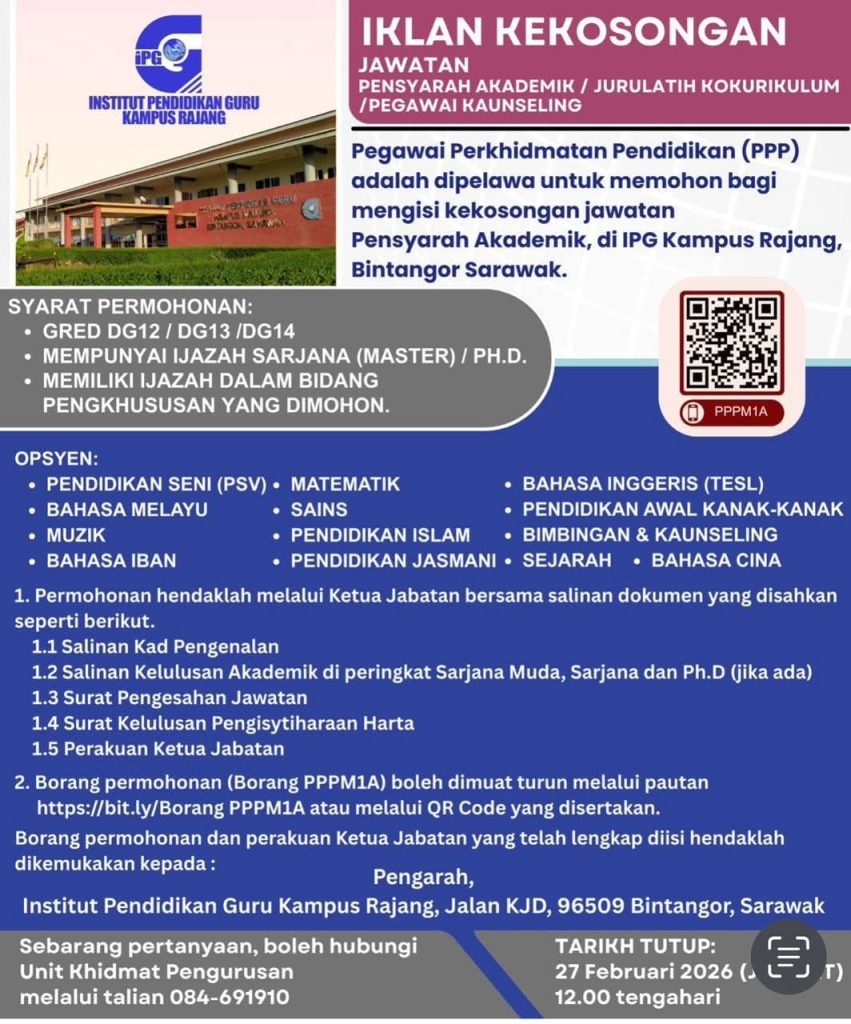 IPG Kampus Rajang, Bintangor Sarawak kini membuka peluang kepada guru berpengalaman untuk mengisi kekosongan sebagai: