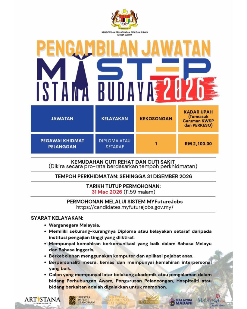 Pengambilan Pegawai Khidmat Pelanggan Istana Budaya melalui program MySTEP 2026 merupakan peluang yang baik kepada graduan Diploma untuk memperoleh pengalaman bekerja dalam agensi kerajaan yang berkaitan dengan seni dan budaya negara.