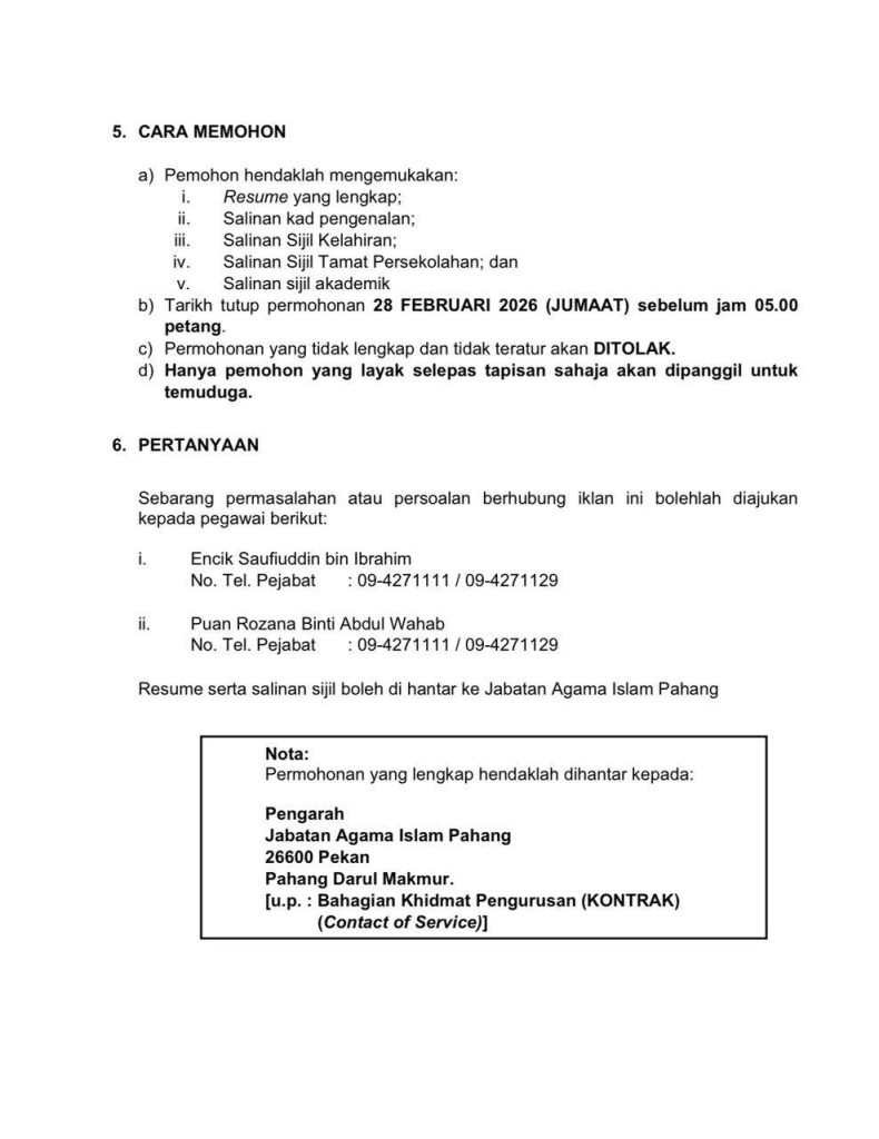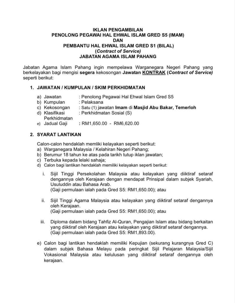 Jawatan Imam dan Bilal di Jabatan Agama Islam Pahang merupakan peluang berharga untuk calon yang berkelayakan menyumbang khidmat kepada agama dan masyarakat. Jika anda memenuhi syarat yang ditetapkan, segera sediakan permohonan sebelum tarikh tutup bagi mengelakkan ketinggalan.