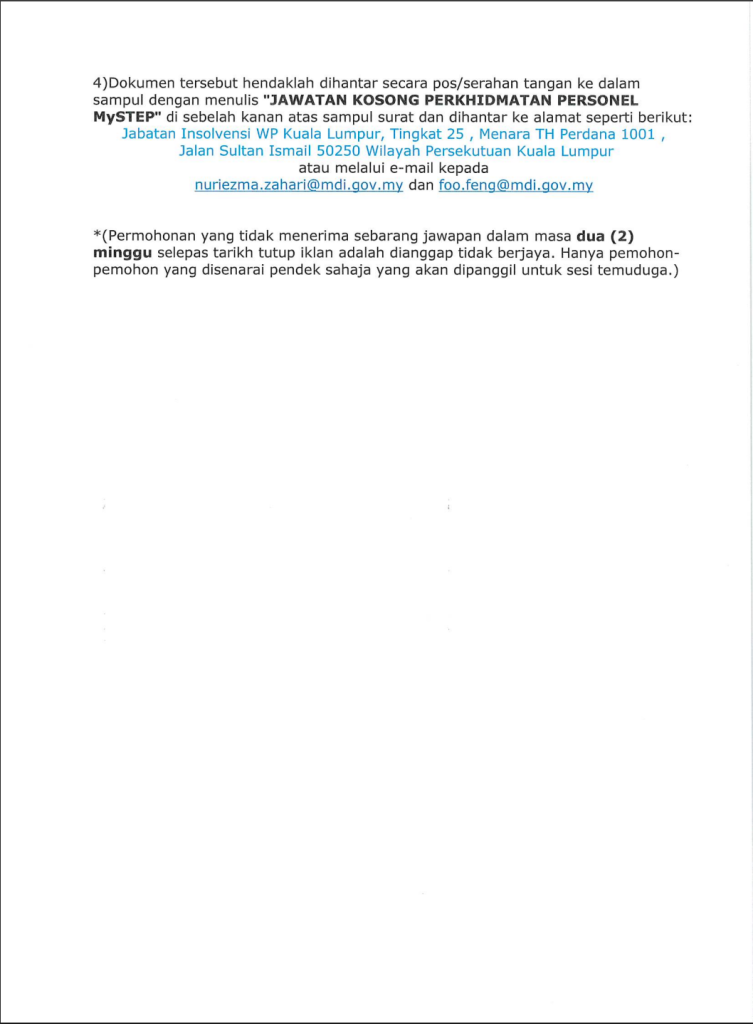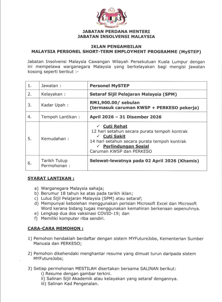 Pengambilan jawatan kosong di bawah program Malaysia Short-Term Employment Programme (MySTEP) kini dibuka oleh Jabatan Insolvensi Malaysia (MDI) bagi cawangan Wilayah Persekutuan Kuala Lumpur.