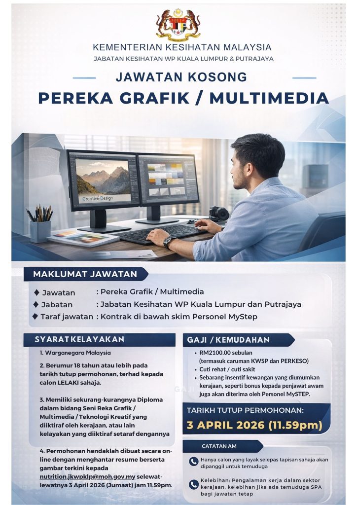 Jawatan kosong Pereka Grafik / Multimedia KKM 2026 kini dibuka kepada rakyat Malaysia yang mempunyai kelayakan dalam bidang kreatif dan multimedia.