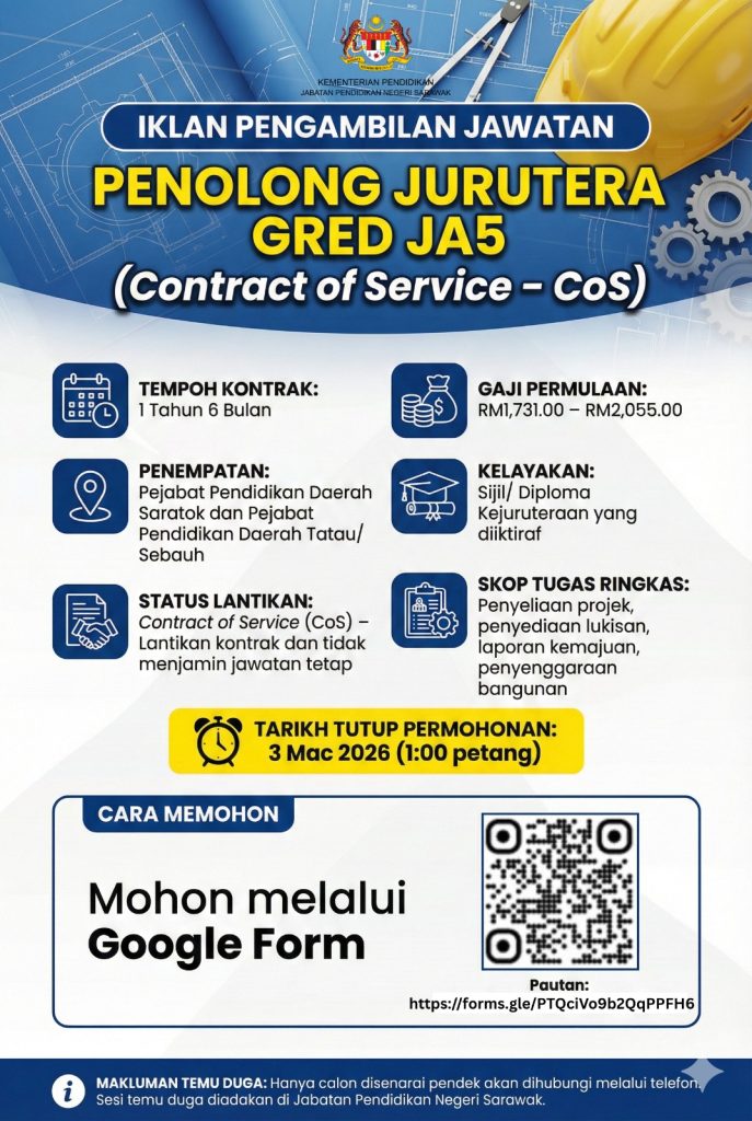 Berita baik buat lepasan Sijil/Diploma Kejuruteraan, khususnya dalam bidang kejuruteraan awam. Jabatan Pendidikan Negeri Sarawak (JPNS) kini membuka peluang kerjaya bagi mengisi kekosongan Penolong Jurutera Gred JA5 secara Contract of Service (CoS) bagi tahun 2026.