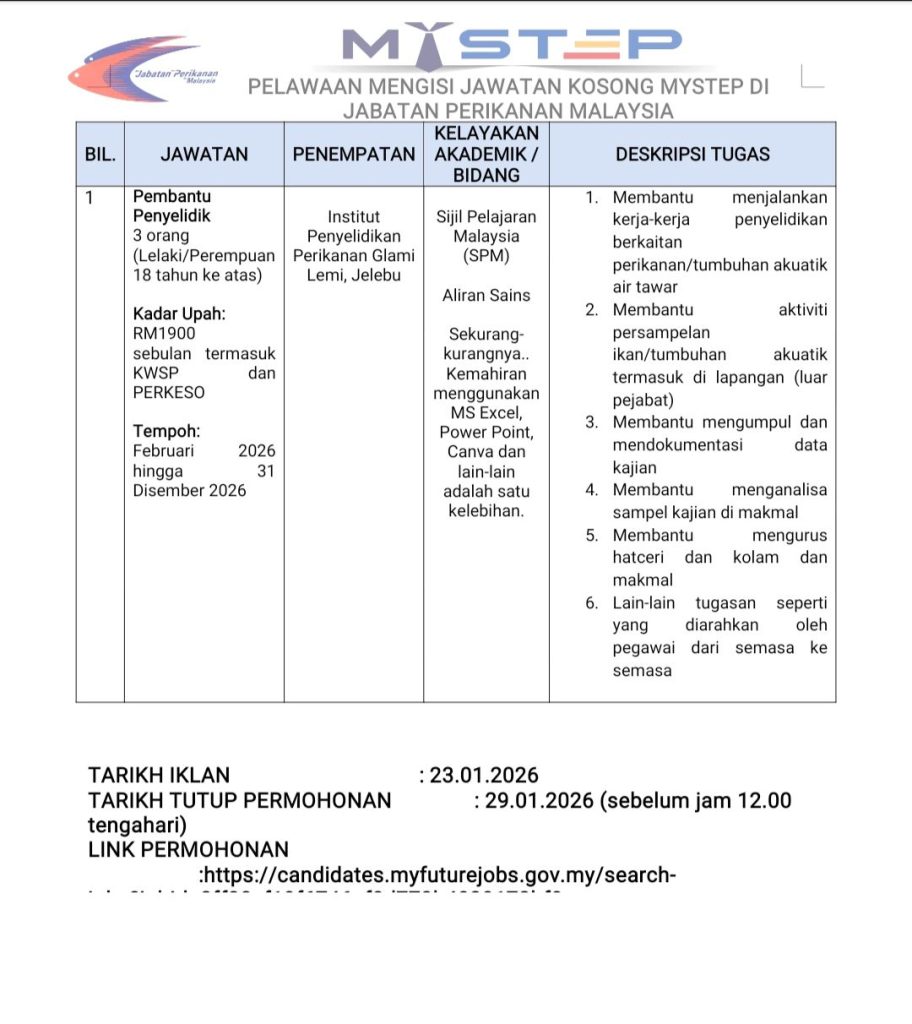 Jawatan Pembantu Penyelidik di bawah MySTEP Jabatan Perikanan Malaysia ini merupakan peluang baik untuk lepasan SPM aliran Sains yang berminat dalam bidang penyelidikan perikanan air tawar dan kerja makmal.