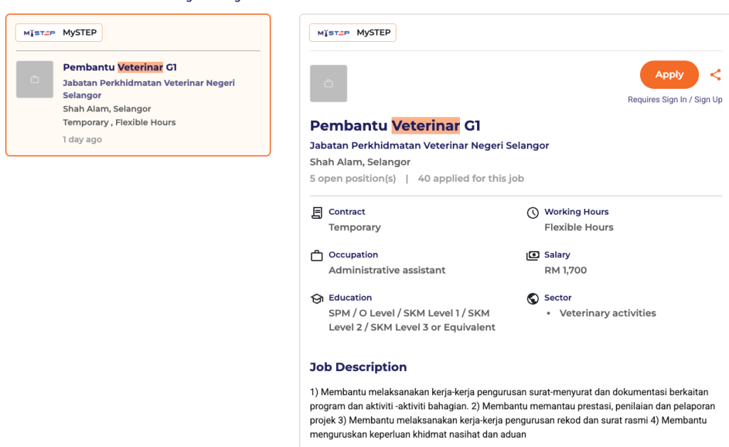 - Cari jawatan “Pembantu Veterinar G1”