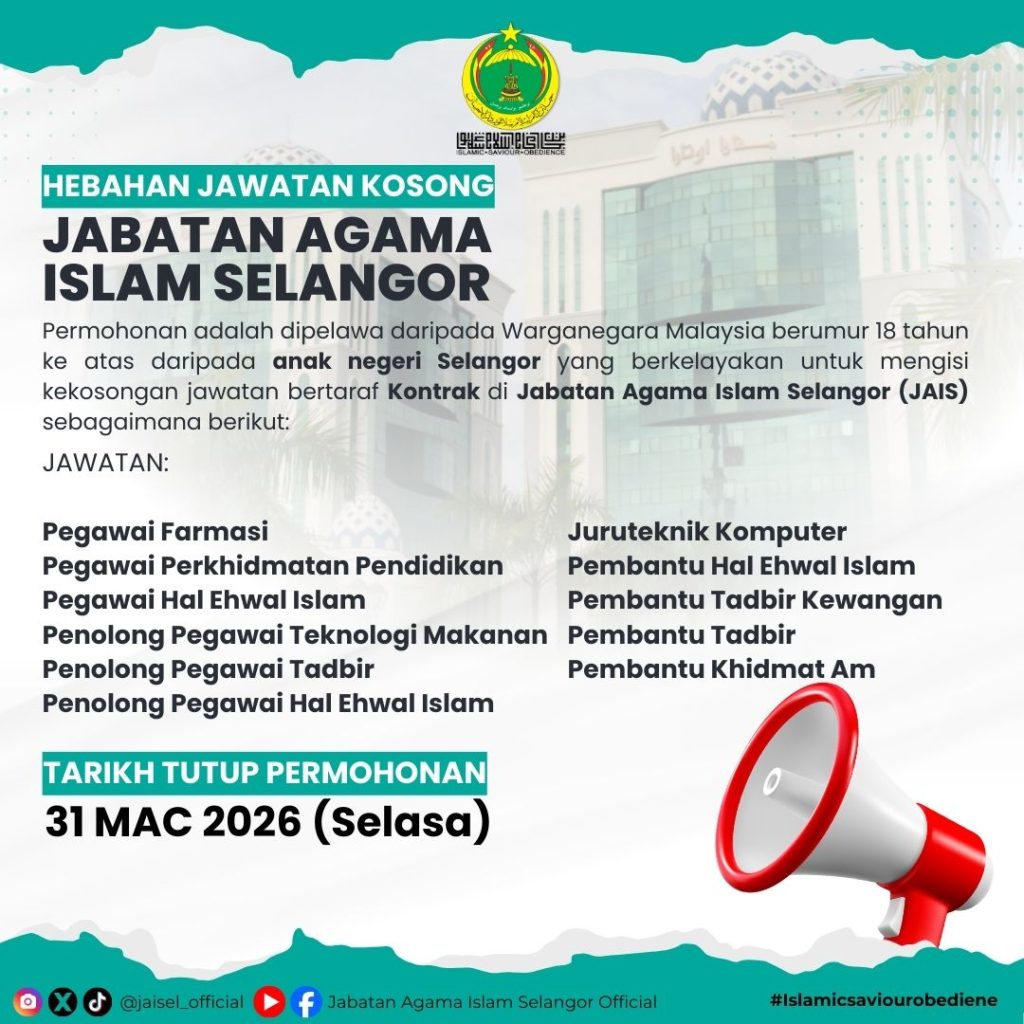 Jabatan Agama Islam Selangor (JAIS) kini membuka peluang kerjaya kepada warganegara Malaysia khususnya anak negeri Selangor yang berminat untuk berkhidmat dalam sektor pentadbiran agama di negeri tersebut. Hebahan rasmi ini memaklumkan bahawa terdapat 63 kekosongan jawatan bertaraf kontrak yang ditawarkan dalam pelbagai bidang perkhidmatan.