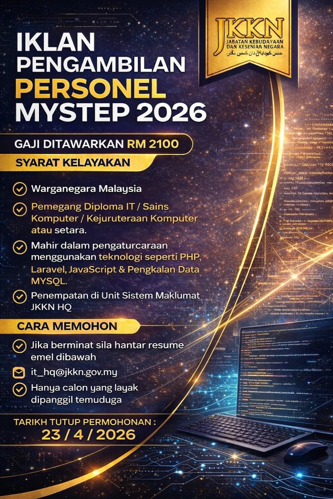 Peluang pekerjaan dalam sektor kerajaan kembali dibuka melalui program MySTEP di bawah Jabatan Kebudayaan dan Kesenian Negara (JKKN). Jawatan ini sesuai untuk calon lepasan diploma dalam bidang IT yang ingin mendapatkan pengalaman kerja sebenar dalam sistem kerajaan.