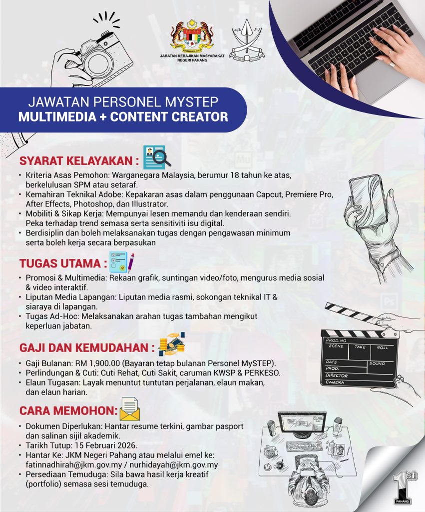 Jawatan Personel MySTEP Multimedia & Content Creator di Jabatan Kebajikan Masyarakat Negeri Pahang ini adalah peluang terbaik untuk individu kreatif digital masuk ke dalam sistem jabatan kerajaan melalui kemahiran sebenar.