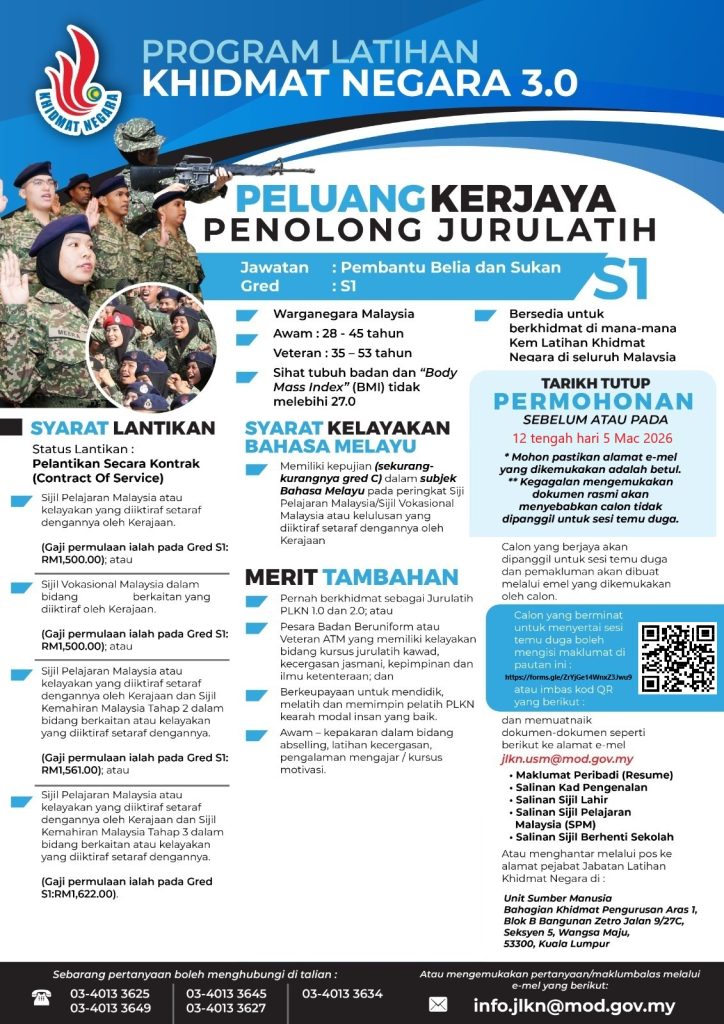 Jawatan Penolong Jurulatih Gred S1 di JLKN merupakan peluang kerjaya yang bermakna bagi individu yang ingin menyumbang kepada pembangunan belia dan negara melalui PLKN 3.0. Jika anda berjiwa lasak, berdisiplin dan komited, inilah peluang untuk anda berkhidmat.
