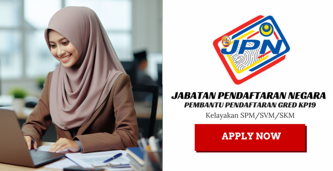Adakah anda sedang mencari peluang untuk berkhidmat dalam sektor awam? Jabatan Pendaftaran Negara kini membuka peluang kepada Warganegara Malaysia yang berkelayakan dan berumur tidak kurang daripada 18 tahun untuk mengisi kekosongan Jawatan Pembantu Pendaftaran KP19.