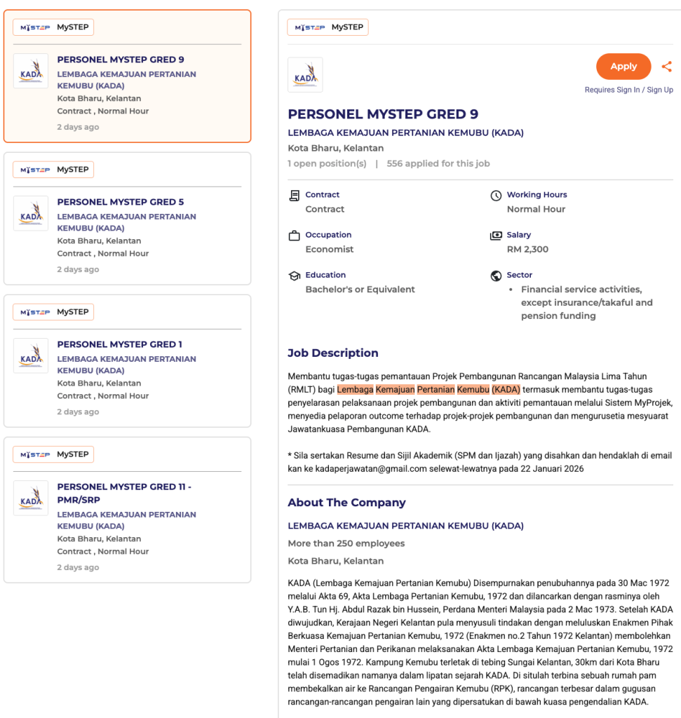 Lembaga Kemajuan Pertanian Kemubu (KADA) kini mengiklankan kekosongan jawatan melalui portal rasmi MyFutureJobs. Calon yang berminat perlu membuat permohonan secara dalam talian melalui sistem tersebut.