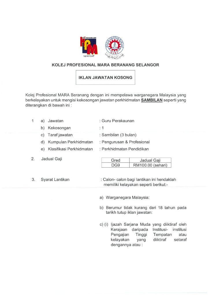 Peluang kerjaya dalam sektor pendidikan kini dibuka kepada individu yang berkelayakan dalam bidang perakaunan. Kolej Profesional MARA Beranang Selangor mempelawa warganegara Malaysia yang berkelayakan untuk mengisi kekosongan jawatan yang ditawarkan.
