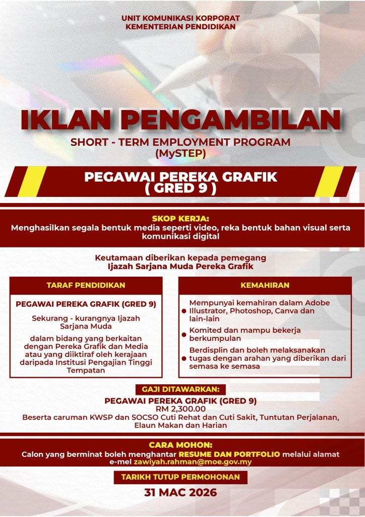 Kementerian Pendidikan Malaysia (KPM) melalui Unit Komunikasi Korporat kini membuka peluang kerjaya kepada rakyat Malaysia untuk mengisi kekosongan jawatan di bawah Program Malaysia Short-Term Employment Program (MySTEP).