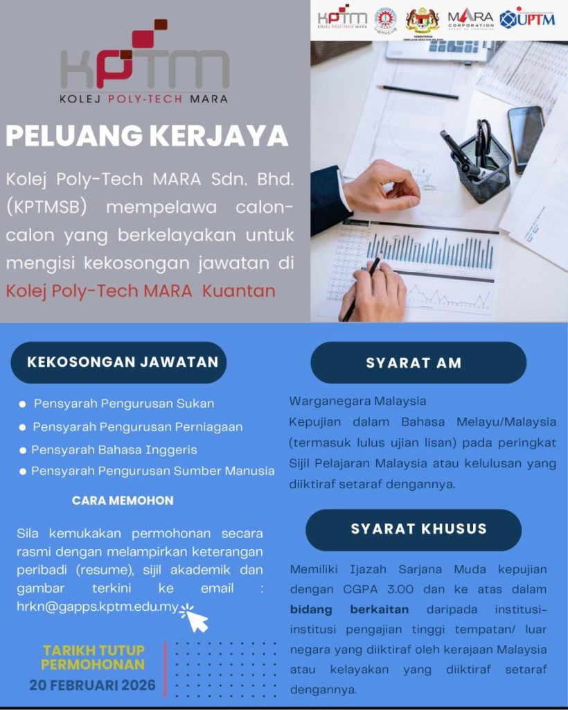 Jawatan Kosong Pensyarah Di Kolej Poly-Tech MARA Kuantan (KPTM) — Tarikh Tutup 20 Februari 2026