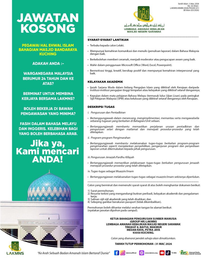 Peluang kerjaya dalam bidang pengurusan masjid dan pembangunan masyarakat Islam kini dibuka apabila Lembaga Amanah Kebajikan Masjid Negeri Sarawak (LAKMNS) mengiklankan kekosongan jawatan Pegawai Hal Ehwal Islam bagi tahun 2026.