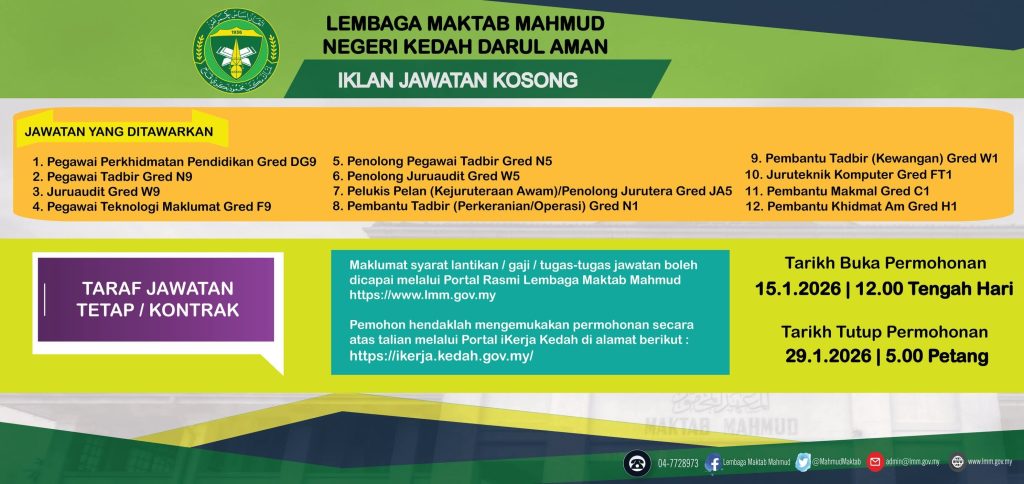 Berita baik buat pencari kerja khususnya rakyat Negeri Kedah. Lembaga Maktab Mahmud Negeri Kedah Darul Aman kini membuka pelbagai jawatan kosong bagi tahun 2026, melibatkan jawatan tetap dan kontrak merangkumi peringkat Pegawai, Penolong Pegawai dan Kumpulan Pelaksana.