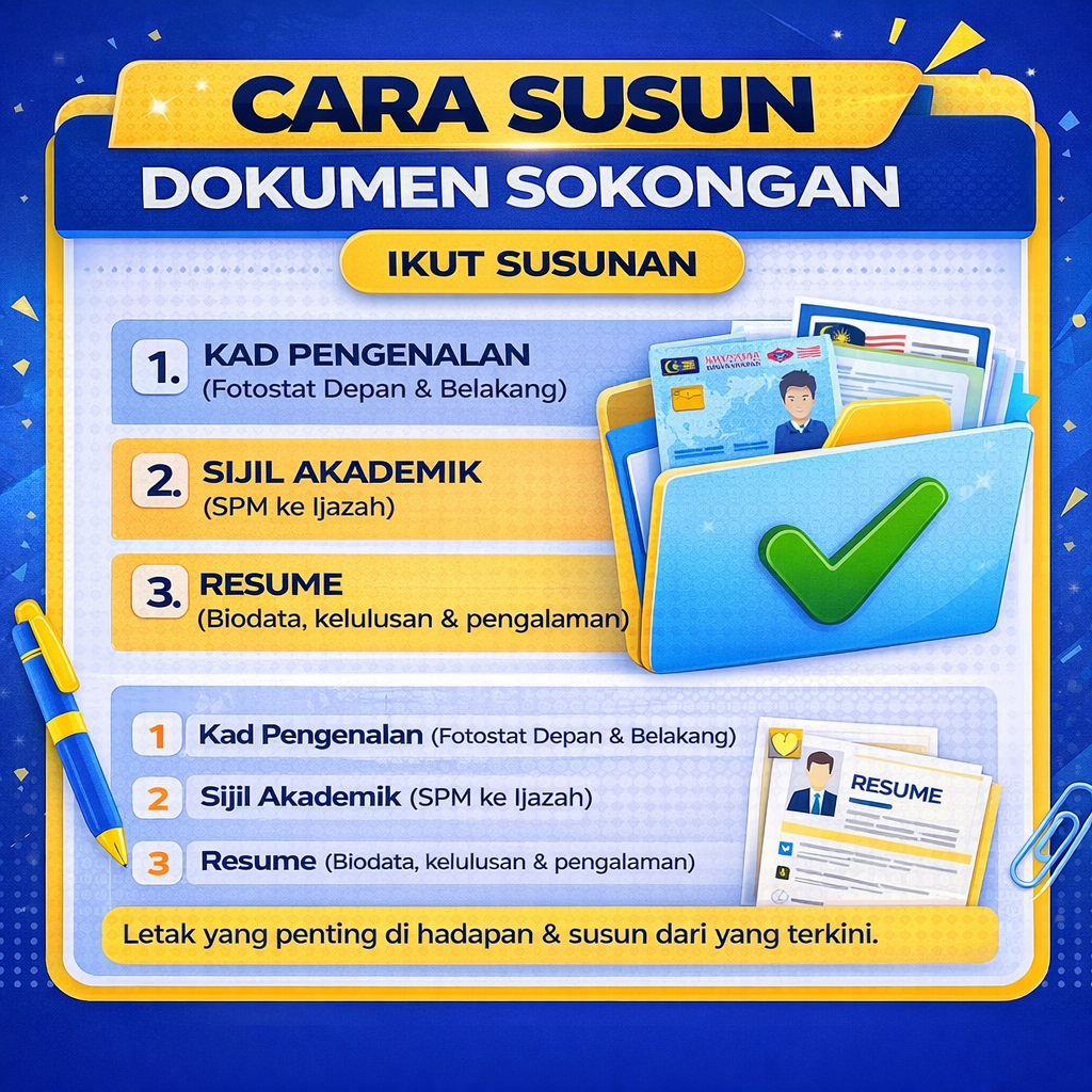 Tip penting: Lengkapkan profil, sediakan dokumen sokongan (IC, sijil akademik, resume) dan mohon awal untuk elak masalah teknikal saat akhir.