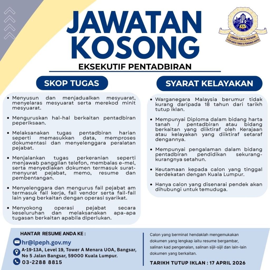 Lembaga Penilai, Pentaksir, Ejen Harta Tanah dan Pengurus Harta (LPEPH) kini membuka peluang kerjaya kepada individu berkelayakan dan berpengalaman untuk mengisi jawatan Eksekutif Pentadbiran Undang-Undang di Kuala Lumpur.