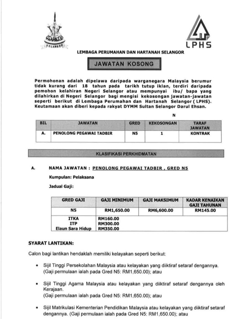 Permohonan jawatan kosong di Lembaga Perumahan dan Hartanah Selangor (LPHS) kini dibuka kepada rakyat Malaysia yang berminat untuk membina kerjaya dalam sektor awam. Peluang ini sangat sesuai untuk lepasan STPM, Matrikulasi dan Diploma yang ingin menceburi bidang pentadbiran kerajaan.