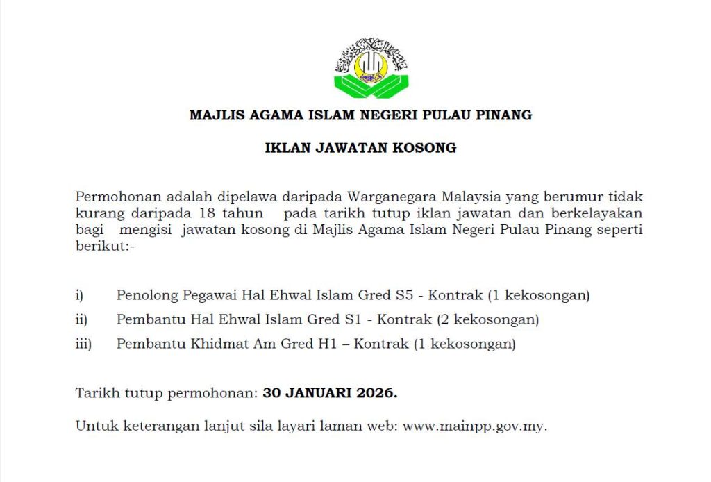 Majlis Agama Islam Negeri Pulau Pinang (MAINPP) kini membuka permohonan jawatan kosong secara kontrak kepada Warganegara Malaysia yang berkelayakan. Peluang ini terbuka kepada calon yang berminat untuk berkhidmat dalam pentadbiran dan perkhidmatan hal ehwal Islam di Pulau Pinang.