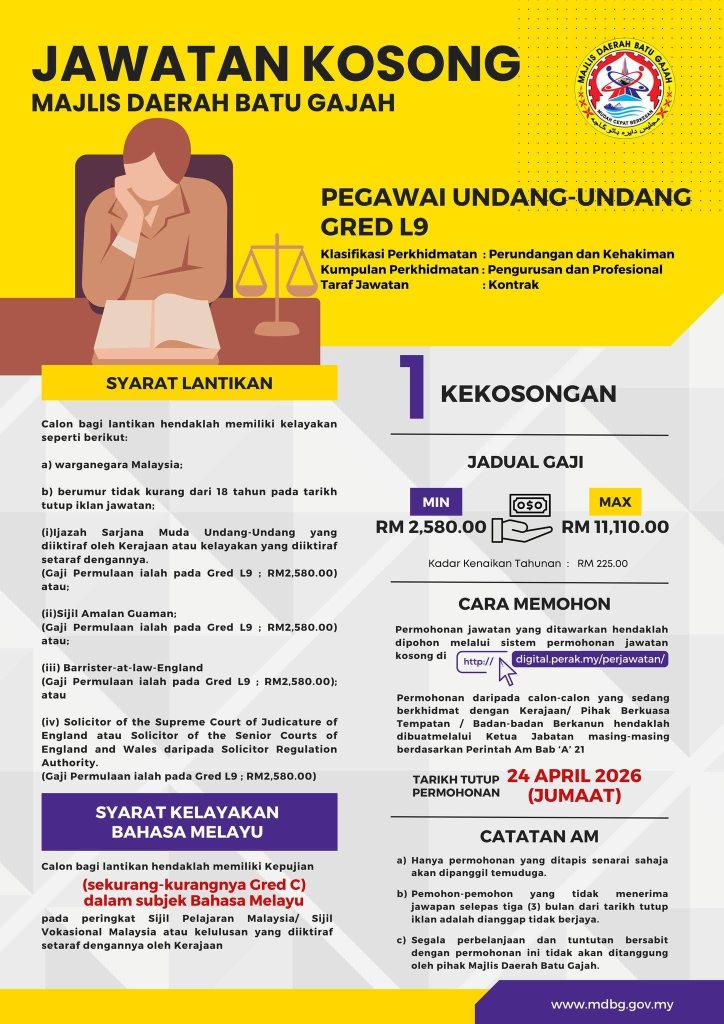 - Pegawai Undang-Undang (Gred L9) – 1 Kekosongan