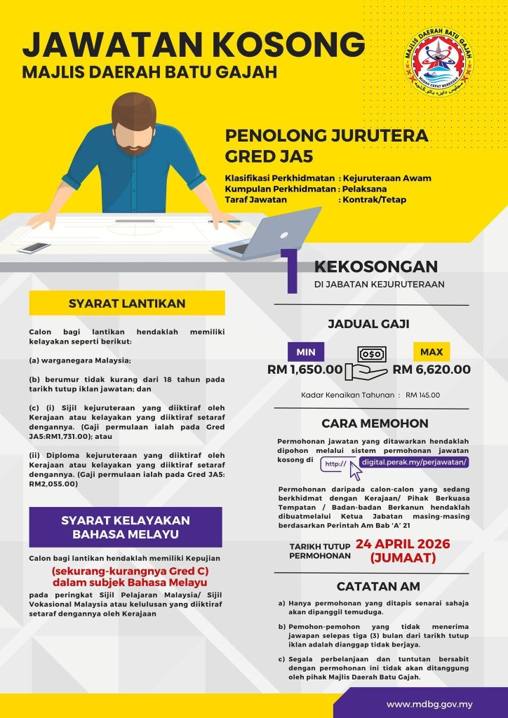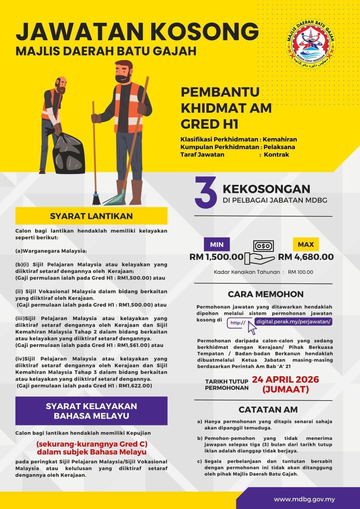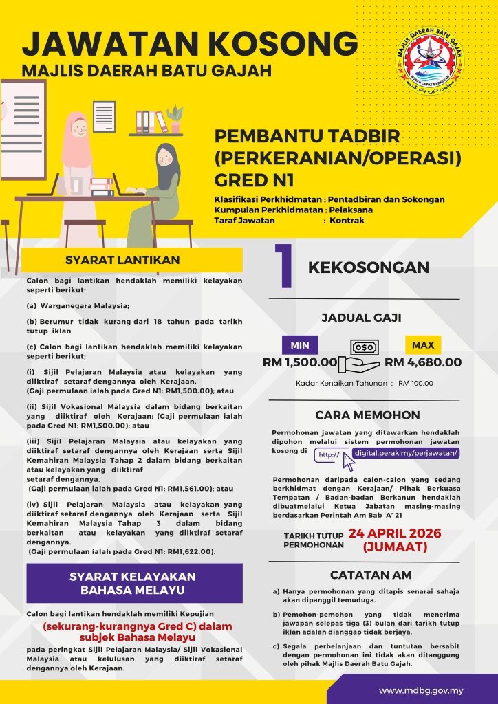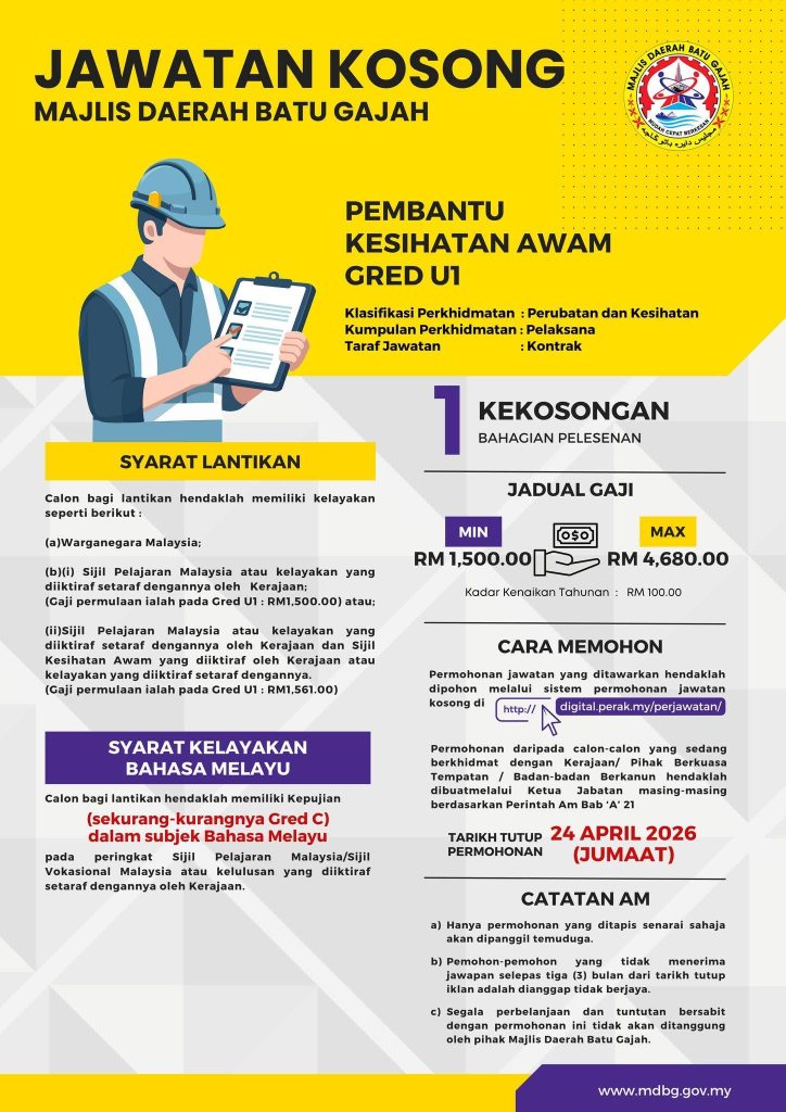 Jawatan kosong di Majlis Daerah Batu Gajah ini merupakan peluang baik untuk calon yang ingin memulakan kerjaya dalam sektor kerajaan, khususnya bagi lepasan SPM dan diploma.