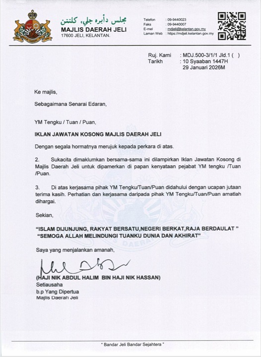 - Borang boleh dimuat turun di laman web rasmi: https://mdjeli.kelantan.gov.my/ atau melalui Facebook rasmi MDJ / imbas QR pada iklan.