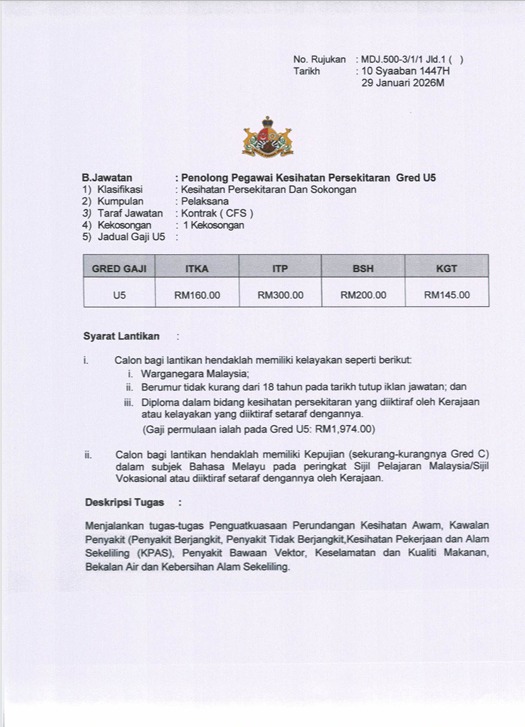 | Penolong Pegawai Kesihatan Persekitaran | U5 | Kesihatan Persekitaran & Sokongan | 1 | RM1,974.00 | RM160 / RM300 / RM200 / RM145 |