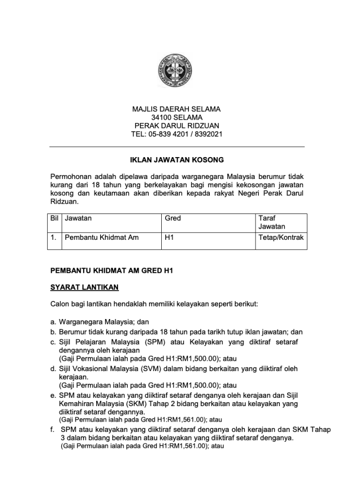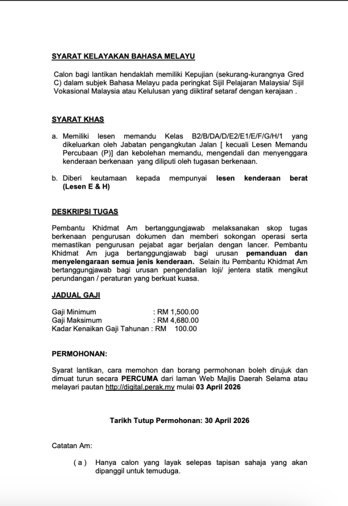 Majlis Daerah Selama kini membuka peluang kepada rakyat Malaysia yang berkelayakan untuk mengisi kekosongan jawatan sebagai Pembantu Khidmat Am Gred H1 bagi tahun 2026. Jawatan ini merupakan antara peluang kerjaya sektor kerajaan yang sesuai untuk lepasan SPM dan TVET yang ingin membina kerjaya stabil dalam perkhidmatan awam.