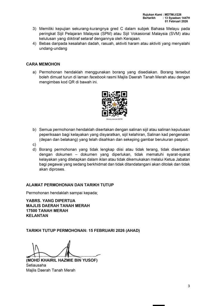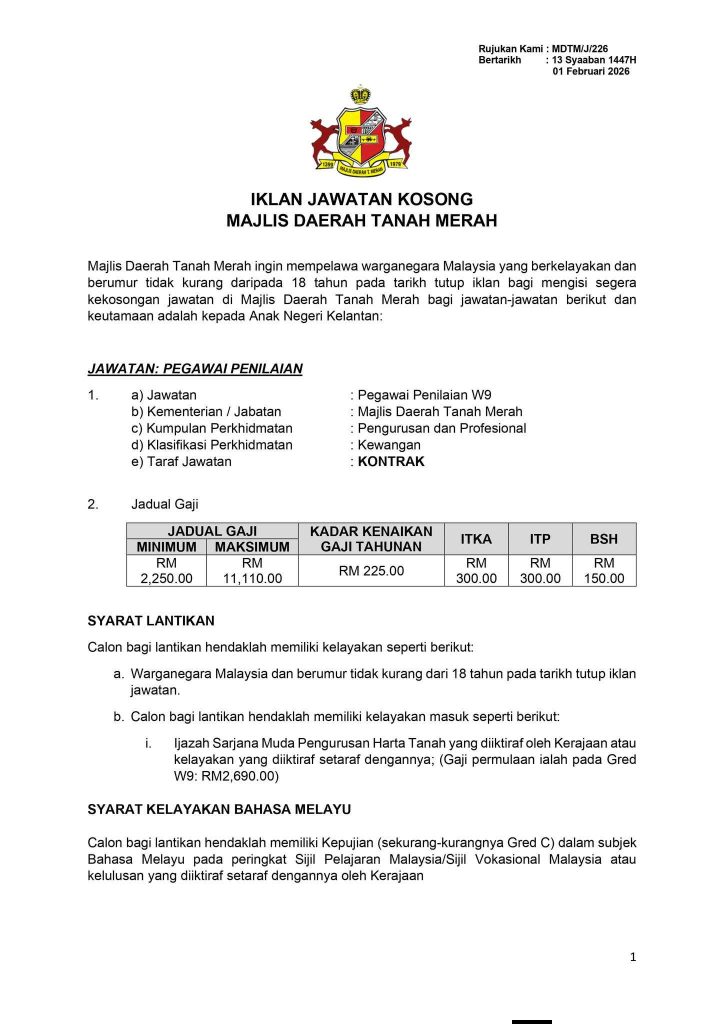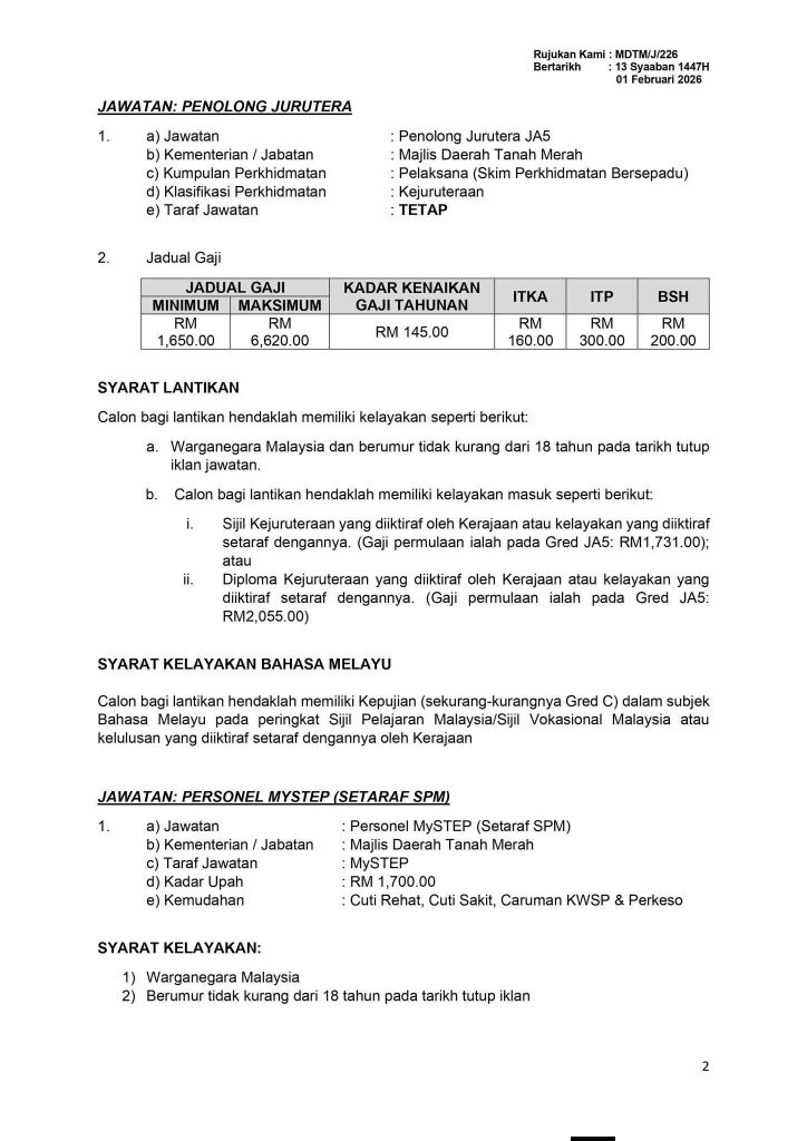 Berita baik kepada pencari kerja di Kelantan. Majlis Daerah Tanah Merah (MDTM) membuka beberapa kekosongan jawatan melibatkan skim Pengurusan & Profesional, Pelaksana (Kejuruteraan) serta MySTEP untuk tahun 2026.