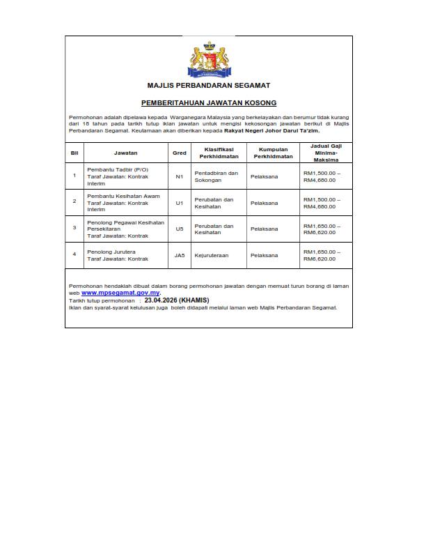 Majlis Perbandaran Segamat (MP Segamat) kini membuka peluang pekerjaan kepada warganegara Malaysia yang berkelayakan. Pengambilan ini melibatkan beberapa jawatan penting dalam sektor pentadbiran, kesihatan awam dan teknikal.